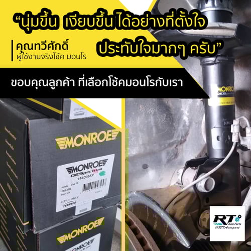 มอนโร โช้คอัพมาตรฐานโลกสัญชาติอเมริกาที่ได้รับความไว้วางใจมานานกว่า 100 ปี เราคือโช้คที่ช่างเทคนิคมืออาชีพจากยุโรปและอเมริกาเลือกใช้ มอนโรเข้าใจว่าโช้คอัพของรถยนต์แต่ละรุ่นนั้นแตกต่างกัน ทีมพัฒนาของเราจึงสร้างโช้คอัพของรถแต่ละรูปแบบด้วยความพิถีพิถันที่แตกต่างกัน โดยโช้คอัพจะถูกทดสอบความนุ่มนวลในการขับขี่และความทนทานในการใช้งานเพื่อให้มั่นใจได้ว่าลูกค้าได้รับโช้คอัพที่สมบูรณ์แบบที่สุด