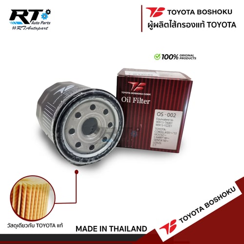 กรองน้ำมันเครื่อง โตโยต้าโบโชกุ (Toyota Boshoku) เป็นอีกหนึ่งผลิตภัณท์ของบริษัท ที่พัฒนาขึ้น เพื่อต้องการให้ลูกค้าได้ใช้กรองน้ำมันเครื่อง กรองอากาศและกรองแอร์ ที่มีคุณภาพตามมาตราฐาน OEM100% โดยมีการใช้วัสดุ การคัดสรรและขั้นตอนการผลิตและการตรวจสอบคุณภาพหลังการผลิตแบบเดียวกับที่ บริษัท Toyota Boshoku Co. ผลิตให้แก่ โรงงานประกอบรถยนตร์โตโยต้า 100%