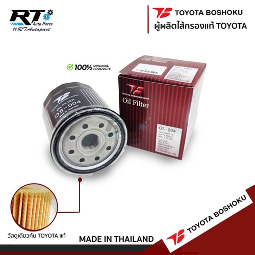 กรองน้ำมันเครื่อง โตโยต้าโบโชกุ (Toyota Boshoku) เป็นอีกหนึ่งผลิตภัณท์ของบริษัท ที่พัฒนาขึ้น เพื่อต้องการให้ลูกค้าได้ใช้กรองน้ำมันเครื่อง กรองอากาศและกรองแอร์ ที่มีคุณภาพตามมาตราฐาน OEM100% โดยมีการใช้วัสดุ การคัดสรรและขั้นตอนการผลิตและการตรวจสอบคุณภาพหลังการผลิตแบบเดียวกับที่ บริษัท Toyota Boshoku Co. ผลิตให้แก่ โรงงานประกอบรถยนตร์โตโยต้า 100%